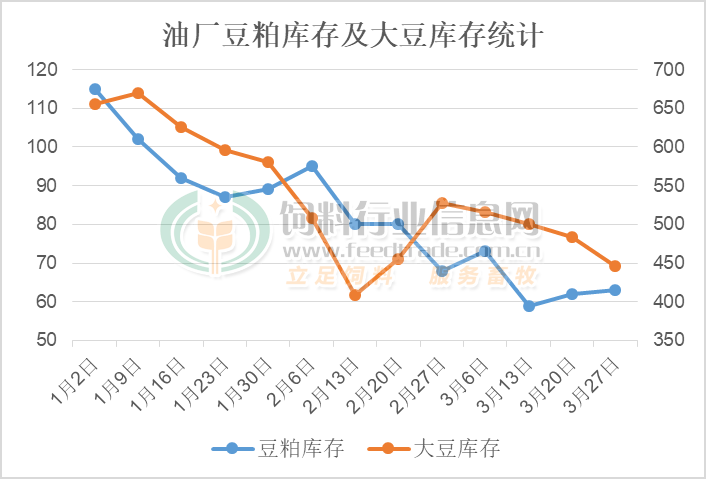 因巴西大豆收割进度缓慢,且中国加强了对进口巴西大豆的杂草及害虫检疫标准后,巴西大豆出口缓慢,进口巴西大豆到港通关进度较慢且数量较少,加之春节后主要油厂开机率恢复后压榨消耗的大豆数量较多后库存逐渐见底,部分油厂只能减产停机等待进口大豆完成通关,最终大豆供应逐渐偏紧。据国家粮食和物资储备数据中心监测显示,截止3月27日,全国主要油厂进口大豆库存 446 万吨,已经连续第四周下降,已经降至春节前低点。