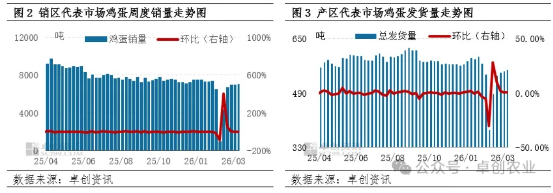 需求转好驱动蛋价走高。随着3月全国返工返校全面开启,团体采购、餐饮消费需求集中释放,主销区鸡蛋销量逐渐回暖。据卓创资讯监测数据显示,主销区代表市场鸡蛋周度销量由3月第1周的6580吨回升至3月第4周的6958吨,销量累计提升5.74%。与此同时,产区发货量同步增加,主产区代表市场鸡蛋发货量由3月第1周的539.00吨回升至3月第4周557.05吨,累计提升3.35%,供需衔接顺畅,有效支撑蛋价稳步上行。