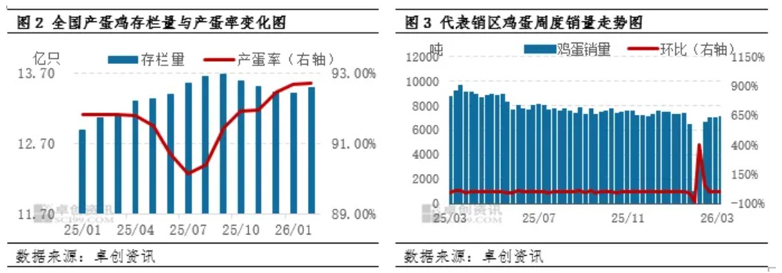 鸡蛋需求量继续恢复,中小码供应偏少,助力蛋价触底反弹。根据卓创资讯监测的数据显示,2月以及3月中上旬全国产区出栏老鸡较少,少于新开产蛋鸡,因此产蛋鸡存栏量反弹增多,大码鸡蛋供应量普遍较充足,3月下旬出栏老鸡开始增多,适当缓解供应压力。2月底全国产蛋鸡存栏量恢复至13.50亿只左右,3月预计环比微幅增多,供应端对蛋价整体呈现利空影响,3月下旬利空影响减弱。而现有蛋鸡中小码产量偏少,一定程度上支撑大码鸡蛋市场价格。需求方面,3月份终端市场逐渐摆脱节后需求阴影,各消费途径销量恢复性增长中,采购活动陆续恢复正常,供需矛盾稍有缓解,3月蛋价呈现小幅下跌后上涨。截至26日,全国鸡蛋日均价3.29元/斤,较月初涨幅9.67%。