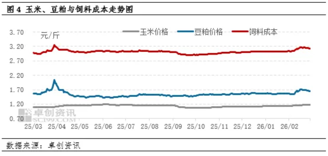 饲料原料价格上涨,推高饲料成本。玉米方面,中旬前产区基层供应量增加,但贸易环节采购成本提升,下游各环节积极采购,以及中东局势变化短时助涨市场看涨预期,全国玉米价格涨势加速。下旬随着政策粮持续投放,且下游抵触高价,市场价格小幅回落。3月全国玉米月度均价2326.66元/吨,环比涨幅3.00%,同比涨幅6.78%。豆粕方面,月初受外部宏观市场影响,外盘美豆期货价格走强,带动国内豆粕市场期现货价格跟涨。此外,进口巴西大豆检疫问题导致国内供应担忧,叠加部分区域存停机计划,多重利多因素提振豆粕价格。中旬后,市场宏观情绪降温,国内需求端表现疲软,拖曳豆粕现货价格回吐前期涨幅。3月43%蛋白豆粕月均价3278元/吨,环比涨幅5.03%,同比跌幅3.63%。养殖支出微增。综合收入与支出,3月26日单斤鸡蛋毛利润已提升至-0.04元。