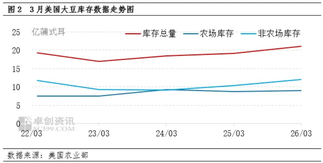 从库存数据看,截至2026年3月1日,美国大豆库存总量为21亿蒲式耳,同比增长10%。农场库存估计为9亿蒲式耳,同比增长3%。农场外库存为12亿蒲式耳,同比增长16%。2025年12月至2026年2月的大豆消费量为11.8亿蒲式耳,同比下降1%。从历年同期的数据走势看,2026年的数据为近5年来的同期最高值,反映出库存对价格的影响偏利空。但由于报告数据与市场预期值基本一致,因此利空的影响已经被提前消化,对美国大豆价格的影响较为有限。