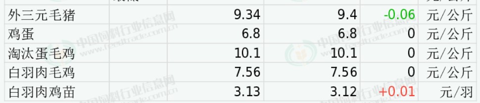 全国淘汰蛋毛鸡均价稳定。清明备货进入尾声,但屠宰及食品厂提前启动五一节前备货,高价采购意愿减弱、成交放缓。预计淘汰鸡价格或震荡调整。今日山东地区淘汰蛋毛鸡均价10.70元/公斤,与昨日价格持平;江苏地区淘汰蛋毛鸡均价10.60元/公斤,与昨日价格持平;辽宁地区淘汰蛋毛鸡均价10.20元/公斤,与昨日价格持平。