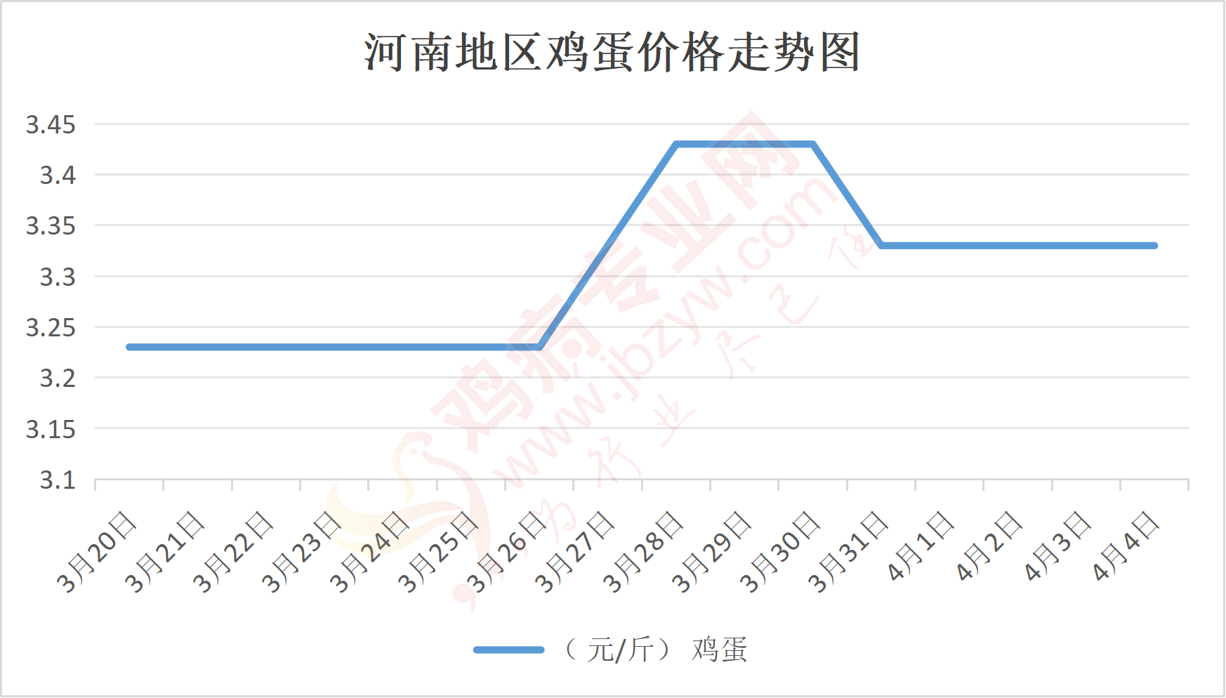 鸡病专业网消息:4月4日,河南郑州鸡蛋3.3元/斤,稳;新密鸡蛋3.3元/斤,稳;荥阳鸡蛋3.3元/斤,稳;中牟鸡蛋3.3元/斤,稳;周口鸡蛋3.25元/斤,稳;商丘鸡蛋97元/30斤,稳;鹤壁鸡蛋3.3元/斤,稳;汝州鸡蛋3.25元/斤,稳;开封鸡蛋97元/30斤,稳;漯河鸡蛋3.25元/斤,稳;漯河临颍鸡蛋3.25元/斤,稳;许昌鸡蛋3.25元/斤,稳;南阳鸡蛋3.25元/斤,稳;南阳邓州鸡蛋3.25元/斤,稳;新乡鸡蛋3.25元/斤,稳;安阳鸡蛋3.25元/斤,稳;新郑鸡蛋3.3元/斤,稳;登封鸡蛋3.3元/斤,稳;平顶山鸡蛋3.25元/斤,稳;驻马店鸡蛋3.25元/斤,稳;三门峡鸡蛋3.25元/斤,稳;焦作鸡蛋3.25元/斤,稳;信阳鸡蛋3.25元/斤,稳;濮阳鸡蛋3.25元/斤,稳。