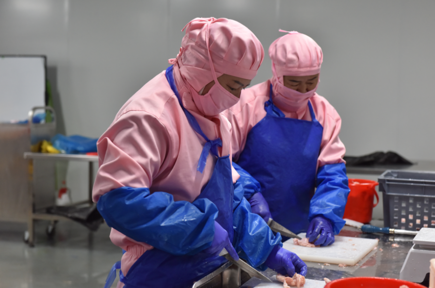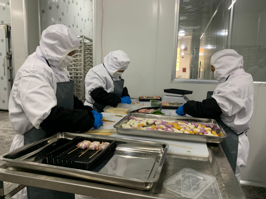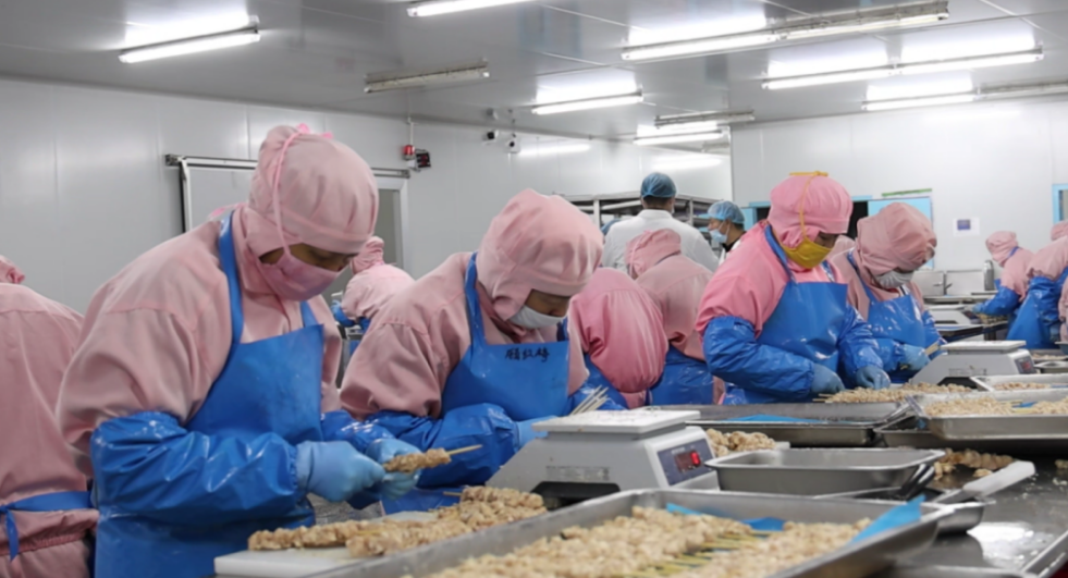 在新振肉制品加工二厂的参观通道内,工人们正有条不紊地开展鸡肉串加工作业,经串制、包装等工序后,产品直接发往订货方。新振发展有限公司负责人冯维敏表示,该合作模式实现了多方共赢,对各个行政村而言,圣农包销全部鸡肉串产品,彻底化解了市场经营风险,让村集体发展无后顾之忧;对圣农而言,将生产线延伸至止马镇,拓展了生产空间,还新增了产能。