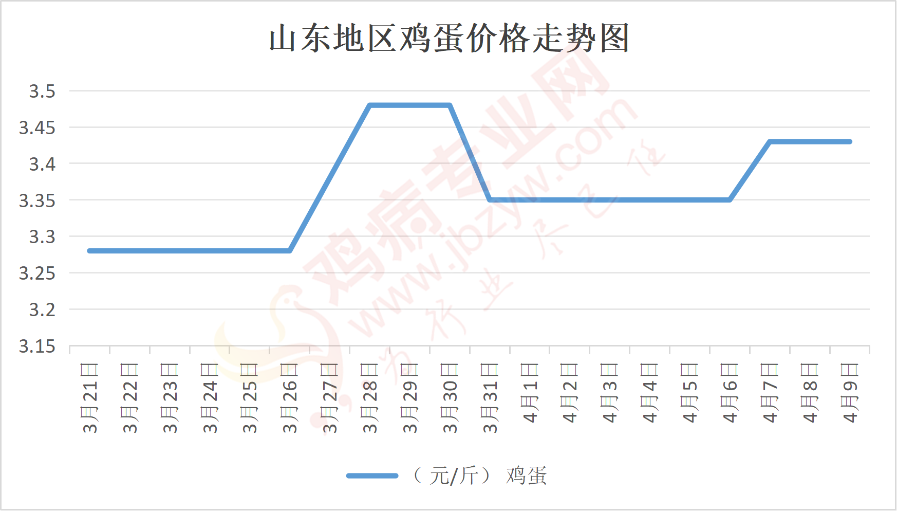 鸡病专业网消息:4月9日,山东地区莱阳鸡蛋3.6元/斤,涨;青岛鸡蛋3.6元/斤,涨;诸城鸡蛋3.55元/斤,涨;安丘鸡蛋3.5元/斤,涨;昌乐鸡蛋3.5元/斤,涨;寿光鸡蛋3.5元/斤,涨;昌邑鸡蛋3.5元/斤,涨;高密鸡蛋3.55元/斤,涨;青州鸡蛋3.5元/斤,涨;临朐鸡蛋3.5元/斤,涨;莱州鸡蛋3.6元/斤,涨;威海鸡蛋3.6元/斤,涨;临沭鸡蛋3.5元/斤,涨;沂水鸡蛋3.5元/斤,涨;沂南鸡蛋3.5元/斤,涨;莒南鸡蛋3.5元/斤,涨;兰陵县鸡蛋3.5元/斤,涨;日照鸡蛋3.5元/斤,涨;莒县鸡蛋3.5元/斤,涨;日照辛萁商贸鸡蛋3.5元/斤,涨;泗水鸡蛋价格105元/30斤,涨;济宁、汶上鸡蛋价格105元/30斤,涨;梁山、东平红蛋价格105元/30斤,涨;枣庄滕州地区鸡蛋混码主流到户106元/30斤,涨;泰安地区新泰鸡蛋价格105元/30斤,涨;菏泽地区曹县主流到户105元/30斤,涨;成武鸡蛋价格105元/30斤,涨;单县到户105元/30斤,涨;聊城莘县105元/30斤,涨;莱芜鸡蛋157元/45斤,涨;济南鸡蛋157元/45斤,涨;德州鸡蛋140元/40斤,涨;滨州鸡蛋140元/40斤,涨。