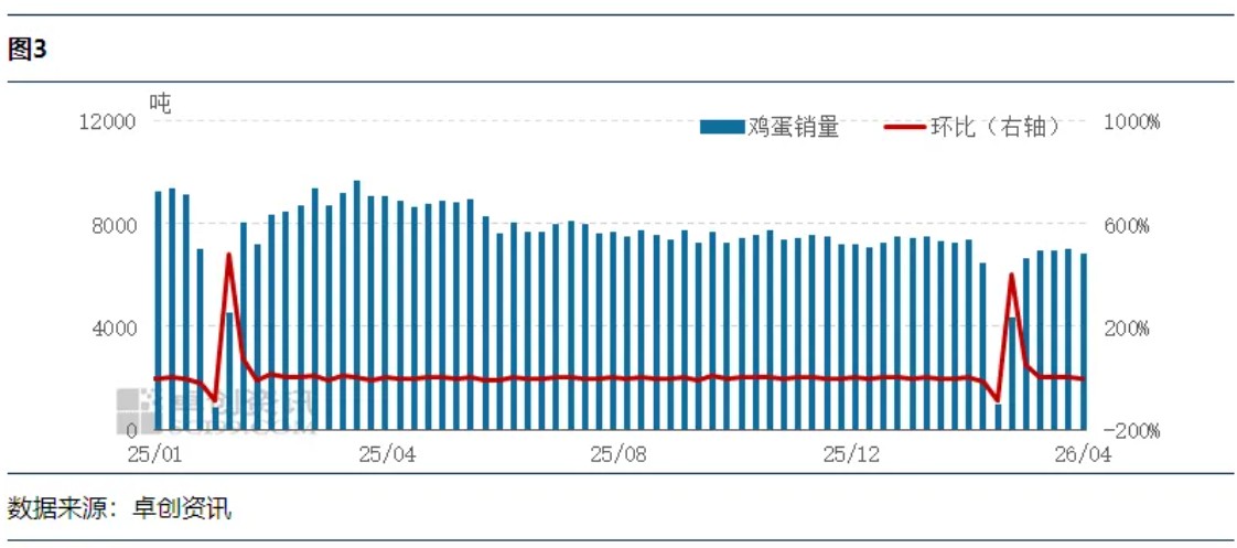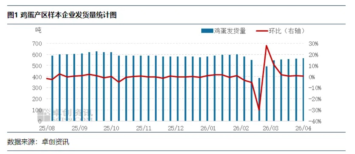 蛋鸡存栏量高位微涨,鸡蛋供应充足。3月新开产蛋鸡主要对应2025年11月前后补栏的鸡苗,该阶段养殖环节补栏意向略有好转,鸡苗补栏量增加,因此3月新开产蛋鸡数量略有增加。3月养殖单位惜售情绪提升,月内老母鸡出栏量不足,导致4月新增产能略高于淘汰产能,在产蛋鸡存栏量环比涨幅0.30%。4月鸡蛋市场整体供应处于充足局面,一定程度上利多鸡蛋发货量。