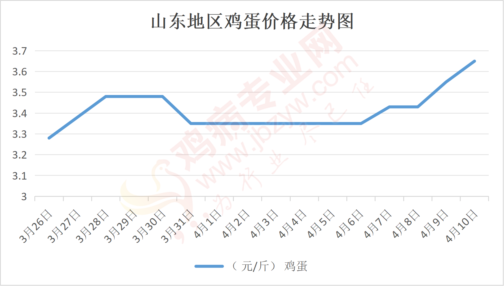 鸡病专业网消息:4月10日,山东地区莱阳鸡蛋3.7元/斤,涨;青岛鸡蛋3.7元/斤,涨;诸城鸡蛋3.65元/斤,涨;安丘鸡蛋3.6元/斤,涨;昌乐鸡蛋3.6元/斤,涨;寿光鸡蛋3.6元/斤,涨;昌邑鸡蛋3.6元/斤,涨;高密鸡蛋3.65元/斤,涨;青州鸡蛋3.6元/斤,涨;临朐鸡蛋3.6元/斤,涨;莱州鸡蛋3.7元/斤,涨;威海鸡蛋3.7元/斤,涨;临沭鸡蛋3.6元/斤,涨;沂水鸡蛋3.6元/斤,涨;沂南鸡蛋3.6元/斤,涨;莒南鸡蛋3.6元/斤,涨;兰陵县鸡蛋3.6元/斤,涨;日照鸡蛋3.6元/斤,涨;莒县鸡蛋3.6元/斤,涨;日照辛萁商贸鸡蛋3.6元/斤,涨;泗水鸡蛋价格108元/30斤,涨;济宁、汶上鸡蛋价格108元/30斤,涨;梁山、东平红蛋价格108元/30斤,涨;枣庄滕州地区鸡蛋混码主流到户109元/30斤,涨;泰安地区新泰鸡蛋价格108元/30斤,涨;菏泽地区曹县主流到户108元/30斤,涨;成武鸡蛋价格108元/30斤,涨;单县到户108元/30斤,涨;聊城莘县108元/30斤,涨;莱芜鸡蛋162元/45斤,涨;济南鸡蛋162元/45斤,涨;德州鸡蛋144元/40斤,涨;滨州鸡蛋144元/40斤,涨。