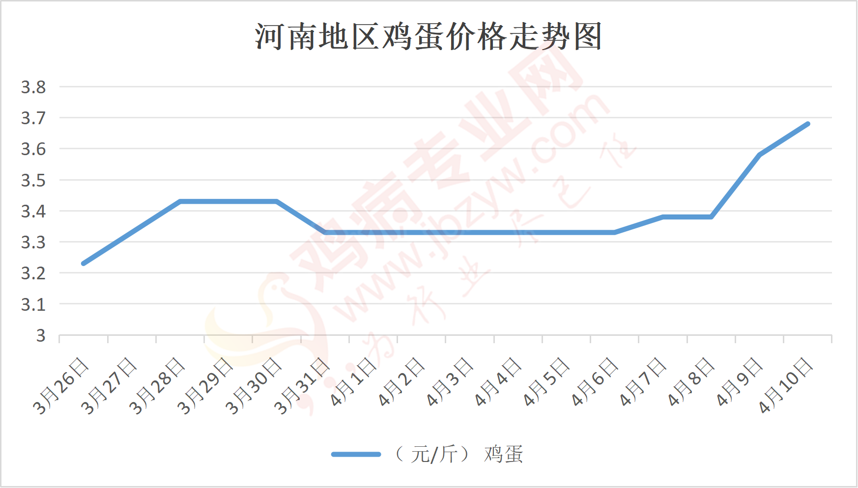 鸡病专业网消息:4月10日,河南郑州鸡蛋3.7元/斤,涨;新密鸡蛋3.7元/斤,涨;荥阳鸡蛋3.7元/斤,涨;中牟鸡蛋3.7元/斤,涨;周口鸡蛋3.65元/斤,涨;商丘鸡蛋109元/30斤,涨;鹤壁鸡蛋3.7元/斤,涨;汝州鸡蛋3.65元/斤,涨;开封鸡蛋109元/30斤,涨;漯河鸡蛋3.65元/斤,涨;漯河临颍鸡蛋3.65元/斤,涨;许昌鸡蛋3.65元/斤,涨;南阳鸡蛋3.65元/斤,涨;南阳邓州鸡蛋3.65元/斤,涨;新乡鸡蛋3.65元/斤,涨;安阳鸡蛋3.65元/斤,涨;新郑鸡蛋3.7元/斤,涨;登封鸡蛋3.7元/斤,涨;平顶山鸡蛋3.65元/斤,涨;驻马店鸡蛋3.65元/斤,涨;三门峡鸡蛋3.65元/斤,涨;焦作鸡蛋3.65元/斤,涨;信阳鸡蛋3.65元/斤,涨;濮阳鸡蛋3.65元/斤,涨。