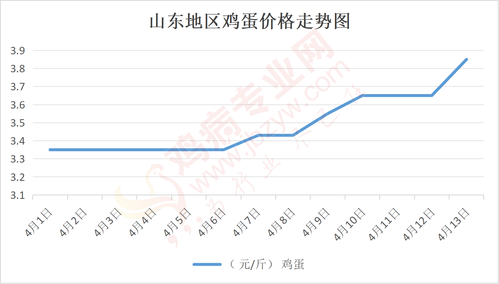 鸡病专业网消息:4月13日,山东地区莱阳鸡蛋3.9元/斤,涨;青岛鸡蛋3.9元/斤,涨;诸城鸡蛋3.85元/斤,涨;安丘鸡蛋3.8元/斤,涨;昌乐鸡蛋3.8元/斤,涨;寿光鸡蛋3.8元/斤,涨;昌邑鸡蛋3.8元/斤,涨;高密鸡蛋3.85元/斤,涨;青州鸡蛋3.8元/斤,涨;临朐鸡蛋3.8元/斤,涨;莱州鸡蛋3.9元/斤,涨;威海鸡蛋3.9元/斤,涨;临沭鸡蛋3.8元/斤,涨;沂水鸡蛋3.8元/斤,涨;沂南鸡蛋3.8元/斤,涨;莒南鸡蛋3.8元/斤,涨;兰陵县鸡蛋3.8元/斤,涨;日照鸡蛋3.8元/斤,涨;莒县鸡蛋3.8元/斤,涨;日照辛萁商贸鸡蛋3.8元/斤,涨;泗水鸡蛋价格114元/30斤,涨;济宁、汶上鸡蛋价格114元/30斤,涨;梁山、东平红蛋价格114元/30斤,涨;枣庄滕州地区鸡蛋混码主流到户115元/30斤,涨;泰安地区新泰鸡蛋价格114元/30斤,涨;菏泽地区曹县主流到户114元/30斤,涨;成武鸡蛋价格114元/30斤,涨;单县到户114元/30斤,涨;聊城莘县114元/30斤,涨;莱芜鸡蛋171元/45斤,涨;济南鸡蛋171元/45斤,涨;德州鸡蛋152元/40斤,涨;滨州鸡蛋152元/40斤,涨。