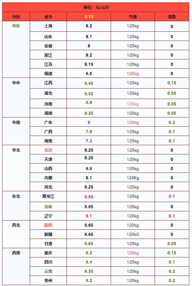 | 华南 | 广东省 | 8.65 | 8.70 | -0.57% | 元/KG |