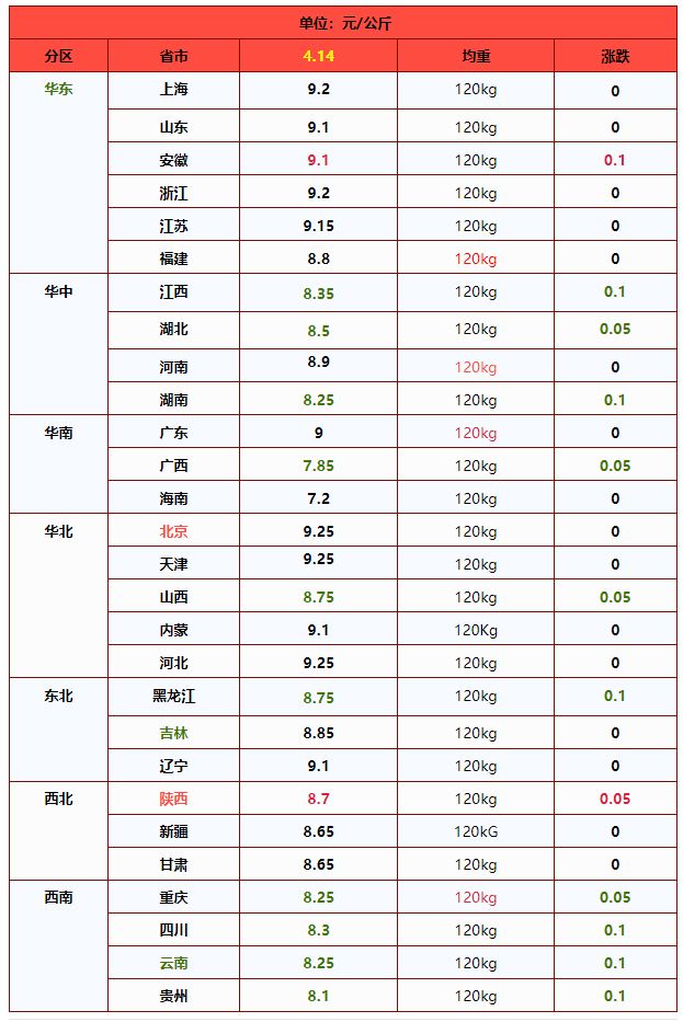 | 河北省 | 9.34 | 9.30 | 0.45% | 元/KG | |