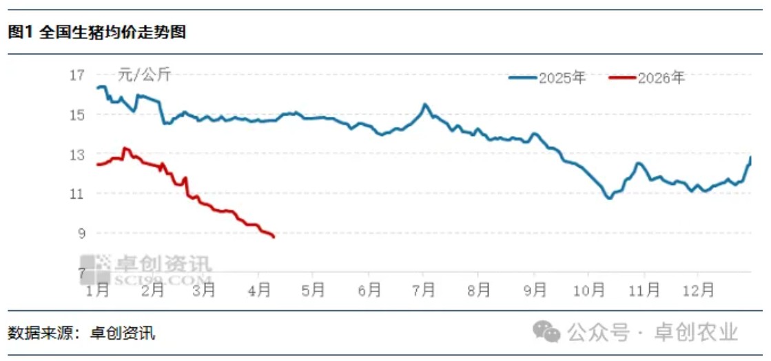 2026年4月13日,中国主流市场出栏外三元、内三元及土杂商品大猪加权日均价较昨日价格下跌,全国生猪出栏加权日均价8.78每公斤,较昨日价格下跌0.28%。猪粮比持续处于深度亏损区间,行业亏损严重。当前市场仍受生猪供应过剩、消费淡季需求疲软拖累,叠加饲料成本偏高,猪价反弹乏力,不过随着国家冻猪肉收储托底及五一节前备货预期逐步显现,短期继续大幅下跌空间有限,预计近期仍将低位震荡。今日全国外三元、内三元及土杂猪均价如下:1) 主流市场外三元大猪全国销售均8.89元每公斤,较昨天价格下跌0.36%;2)主流市场内三元大猪全国销售均价8.52元每公斤,较昨天价格上涨0.01%;3)主流市场土杂大猪全国销售均价8.12元每公斤,较昨天价格下跌0.37%。