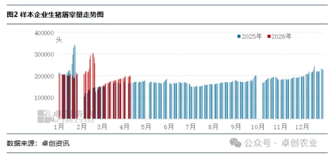 由于4月以来,清明后,国内南北地区气温持续回暖,生猪育肥食欲提升,中小标猪育肥增重加快,现阶段适重标猪供应水平明显增加,且,标肥价差出现倒挂现象!天气进一步转暖,进一步利空肥猪消费,阶段性压栏增重缺乏性价比,反而亏损面临进一步增加的压力,养殖端被动出栏情绪偏强,多方养殖主体月内出栏意愿较高!