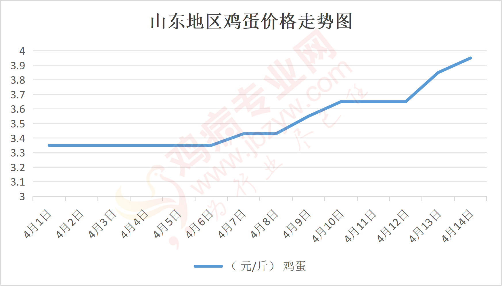 鸡病专业网消息:4月14日,山东地区莱阳鸡蛋4元/斤,涨;青岛鸡蛋4元/斤,涨;诸城鸡蛋3.95元/斤,涨;安丘鸡蛋3.9元/斤,涨;昌乐鸡蛋3.9元/斤,涨;寿光鸡蛋3.9元/斤,涨;昌邑鸡蛋3.9元/斤,涨;高密鸡蛋3.95元/斤,涨;青州鸡蛋3.9元/斤,涨;临朐鸡蛋3.9元/斤,涨;莱州鸡蛋4元/斤,涨;威海鸡蛋4元/斤,涨;临沭鸡蛋3.9元/斤,涨;沂水鸡蛋3.9元/斤,涨;沂南鸡蛋3.9元/斤,涨;莒南鸡蛋3.9元/斤,涨;兰陵县鸡蛋3.9元/斤,涨;日照鸡蛋3.9元/斤,涨;莒县鸡蛋3.9元/斤,涨;日照辛萁商贸鸡蛋3.9元/斤,涨;泗水鸡蛋价格117元/30斤,涨;济宁、汶上鸡蛋价格117元/30斤,涨;梁山、东平红蛋价格117元/30斤,涨;枣庄滕州地区鸡蛋混码主流到户118元/30斤,涨;泰安地区新泰鸡蛋价格117元/30斤,涨;菏泽地区曹县主流到户117元/30斤,涨;成武鸡蛋价格117元/30斤,涨;单县到户117元/30斤,涨;聊城莘县117元/30斤,涨;莱芜鸡蛋175元/45斤,涨;济南鸡蛋175元/45斤,涨;德州鸡蛋156元/40斤,涨;滨州鸡蛋156元/40斤,涨。