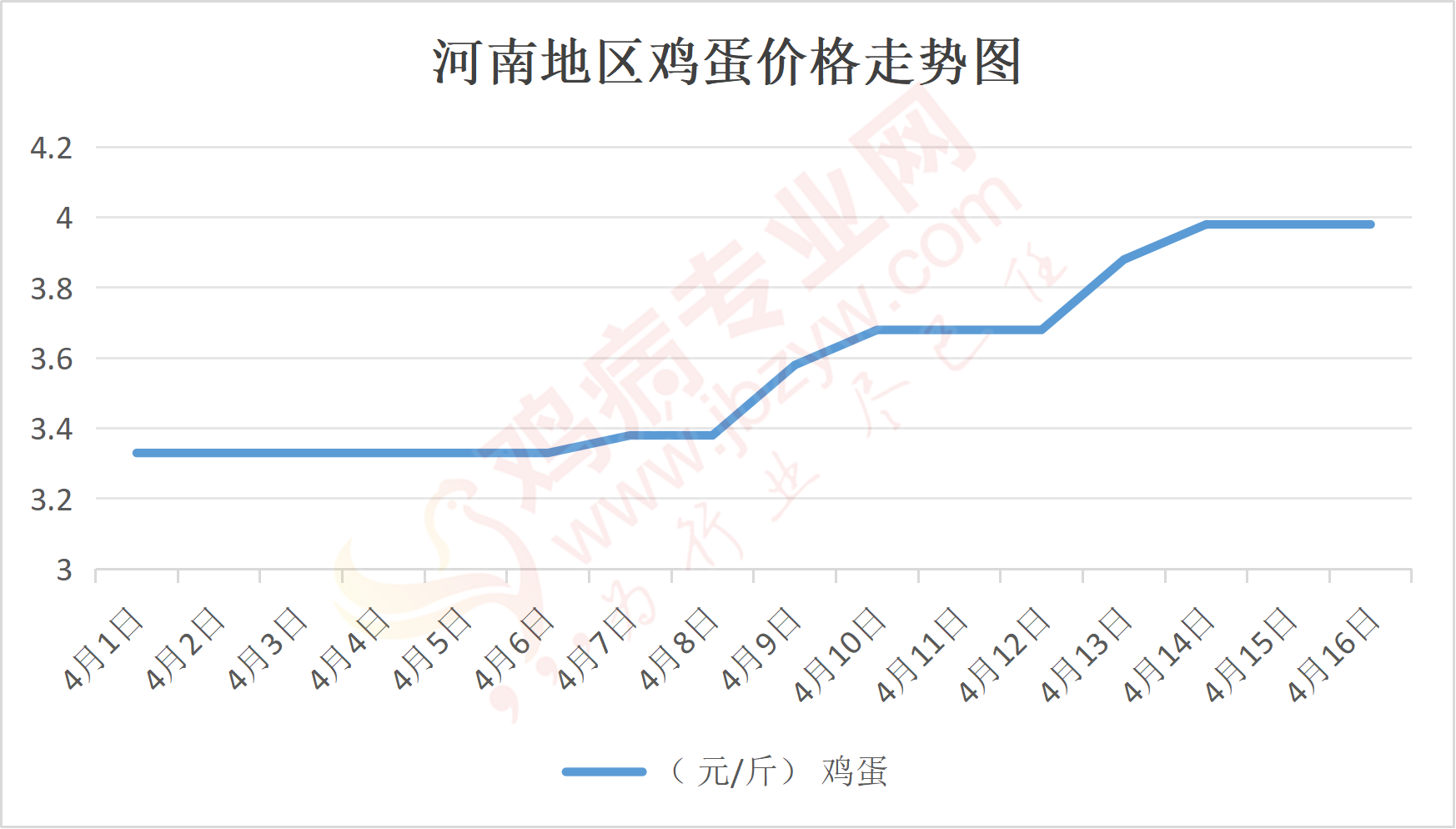鸡病专业网消息:4月16日,河南郑州鸡蛋3.9元/斤,稳;新密鸡蛋3.9元/斤,稳;荥阳鸡蛋3.9元/斤,稳;中牟鸡蛋3.9元/斤,稳;周口鸡蛋3.85元/斤,稳;商丘鸡蛋118元/30斤,稳;鹤壁鸡蛋3.9元/斤,稳;汝州鸡蛋3.85元/斤,稳;开封鸡蛋118元/30斤,稳;漯河鸡蛋3.85元/斤,稳;漯河临颍鸡蛋3.85元/斤,稳;许昌鸡蛋3.85元/斤,稳;南阳鸡蛋3.85元/斤,稳;南阳邓州鸡蛋3.85元/斤,稳;新乡鸡蛋3.85元/斤,稳;安阳鸡蛋3.85元/斤,稳;新郑鸡蛋3.9元/斤,稳;登封鸡蛋3.9元/斤,稳;平顶山鸡蛋3.85元/斤,稳;驻马店鸡蛋3.85元/斤,稳;三门峡鸡蛋3.85元/斤,稳;焦作鸡蛋3.85元/斤,稳;信阳鸡蛋3.85元/斤,稳;濮阳鸡蛋3.85元/斤,稳。