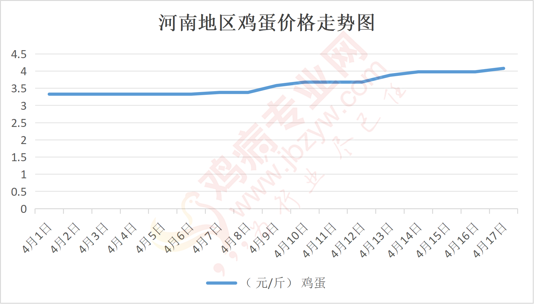 鸡病专业网消息:4月17日,河南郑州鸡蛋4.1元/斤,涨;新密鸡蛋4.1元/斤,涨;荥阳鸡蛋4.1元/斤,涨;中牟鸡蛋4.1元/斤,涨;周口鸡蛋4.05元/斤,涨;商丘鸡蛋122元/30斤,涨;鹤壁鸡蛋4.1元/斤,涨;汝州鸡蛋4.05元/斤,涨;开封鸡蛋122元/30斤,涨;漯河鸡蛋4.05元/斤,涨;漯河临颍鸡蛋4.05元/斤,涨;许昌鸡蛋4.05元/斤,涨;南阳鸡蛋4.05元/斤,涨;南阳邓州鸡蛋4.05元/斤,涨;新乡鸡蛋4.05元/斤,涨;安阳鸡蛋4.05元/斤,涨;新郑鸡蛋4.1元/斤,涨;登封鸡蛋4.1元/斤,涨;平顶山鸡蛋4.05元/斤,涨;驻马店鸡蛋4.05元/斤,涨;三门峡鸡蛋4.05元/斤,涨;焦作鸡蛋4.05元/斤,涨;信阳鸡蛋4.05元/斤,涨;濮阳鸡蛋4.05元/斤,涨。