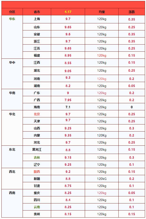 | 东北 | 辽宁省 | 9.17 | 9.09 | 0.92% | 元/KG |