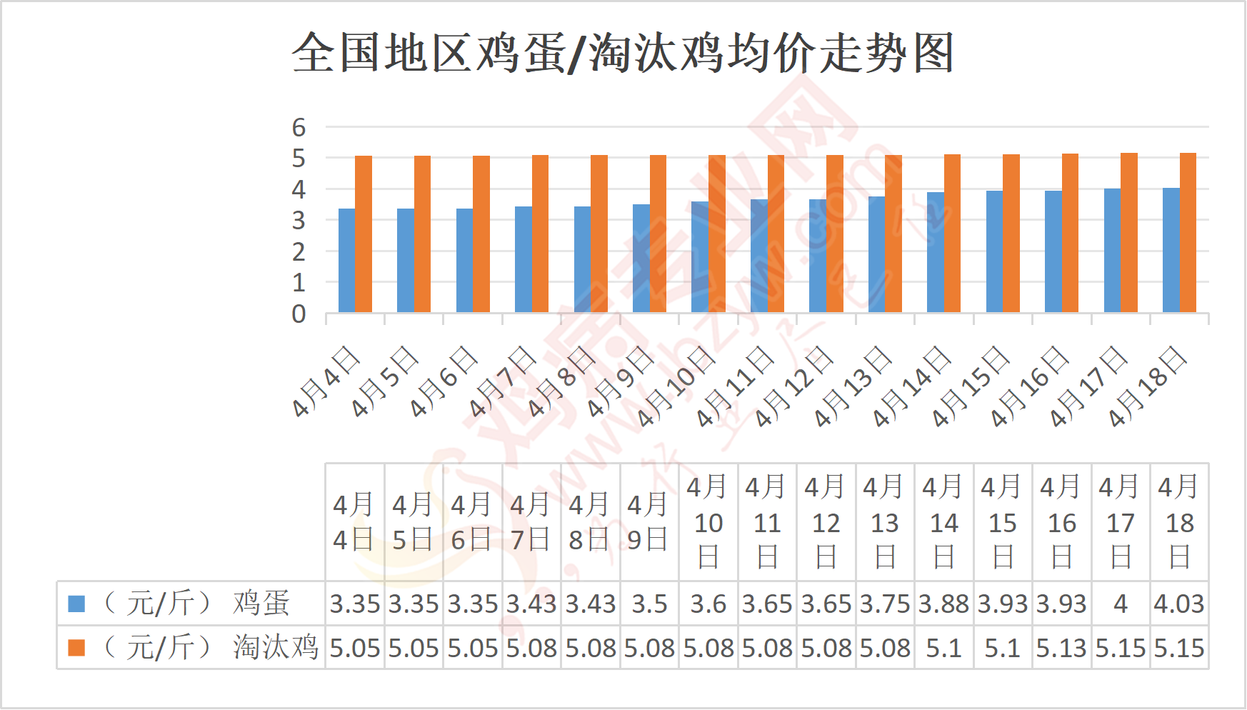 河南地区:南阳鸡蛋4.05元/斤,与昨日相比持平,淘汰鸡5.3元/斤;