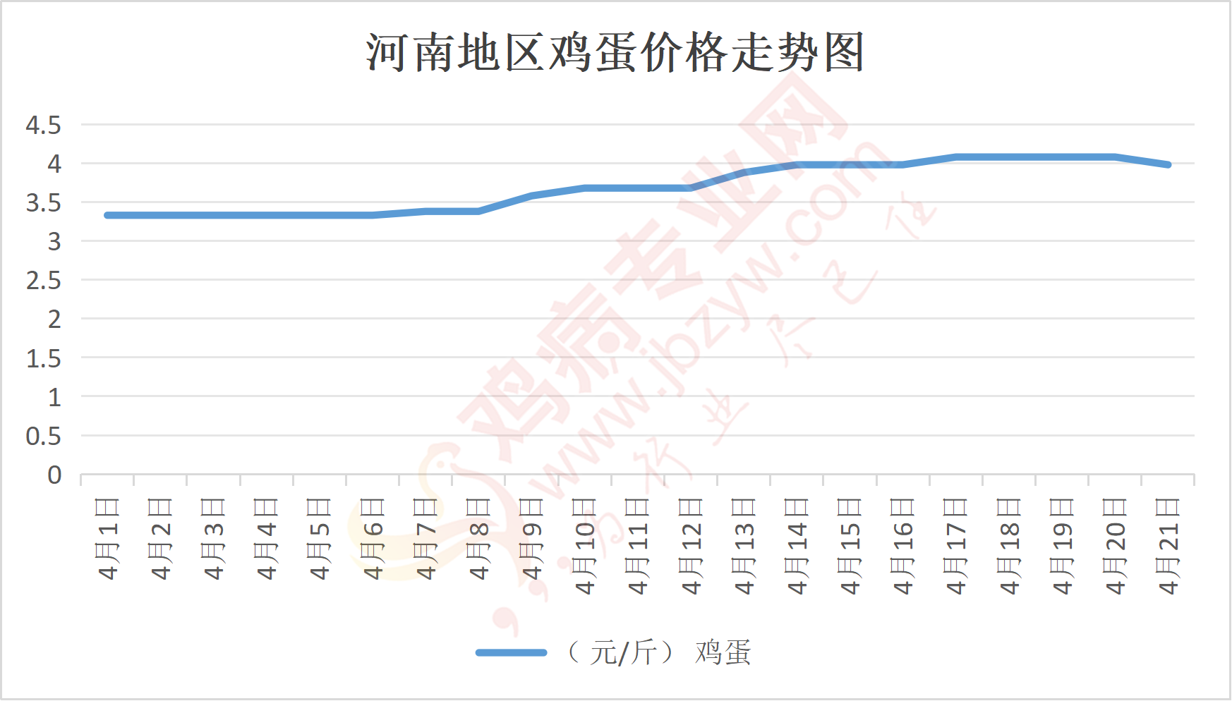 鸡病专业网消息:4月21日,河南郑州鸡蛋4元/斤,落;新密鸡蛋4元/斤,落;荥阳鸡蛋4元/斤,落;中牟鸡蛋4元/斤,落;周口鸡蛋3.95元/斤,落;商丘鸡蛋119元/30斤,落;鹤壁鸡蛋4元/斤,落;汝州鸡蛋3.95元/斤,落;开封鸡蛋119元/30斤,落;漯河鸡蛋3.95元/斤,落;漯河临颍鸡蛋3.95元/斤,落;许昌鸡蛋3.95元/斤,落;南阳鸡蛋3.95元/斤,落;南阳邓州鸡蛋3.95元/斤,落;新乡鸡蛋3.95元/斤,落;安阳鸡蛋3.95元/斤,落;新郑鸡蛋4元/斤,落;登封鸡蛋4元/斤,落;平顶山鸡蛋3.95元/斤,落;驻马店鸡蛋3.95元/斤,落;三门峡鸡蛋3.95元/斤,落;焦作鸡蛋3.95元/斤,落;信阳鸡蛋3.95元/斤,落;濮阳鸡蛋3.95元/斤,落。