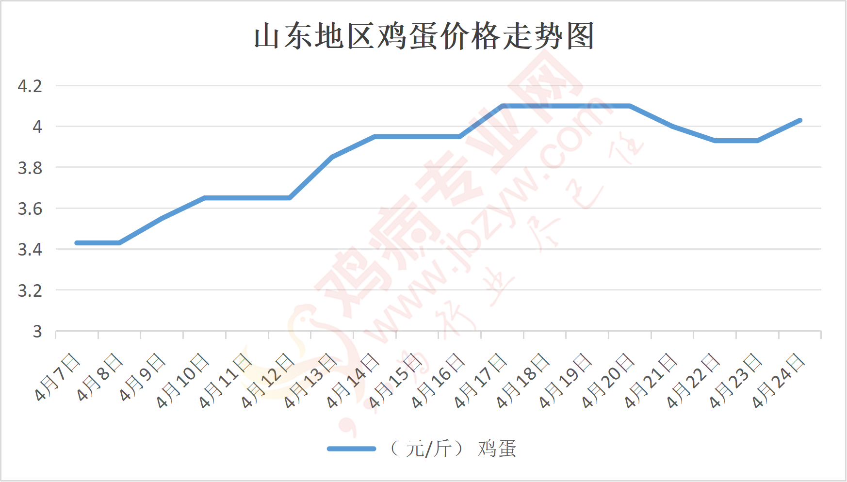 鸡病专业网消息:4月24日,山东地区莱阳鸡蛋4.05元/斤,涨;青岛鸡蛋4.05元/斤,涨;诸城鸡蛋4元/斤,涨;安丘鸡蛋4元/斤,涨;昌乐鸡蛋4元/斤,涨;寿光鸡蛋4元/斤,涨;昌邑鸡蛋4元/斤,涨;高密鸡蛋4元/斤,涨;青州鸡蛋4元/斤,涨;临朐鸡蛋4元/斤,涨;莱州鸡蛋4.05元/斤,涨;威海鸡蛋4.05元/斤,涨;临沭鸡蛋4元/斤,涨;沂水鸡蛋4元/斤,涨;沂南鸡蛋4元/斤,涨;莒南鸡蛋4元/斤,涨;兰陵县鸡蛋4元/斤,涨;日照鸡蛋4元/斤,涨;莒县鸡蛋4元/斤,涨;日照辛萁商贸鸡蛋4元/斤,涨;泗水鸡蛋价格118元/30斤,涨;济宁、汶上鸡蛋价格118元/30斤,涨;梁山、东平红蛋价格118元/30斤,涨;枣庄滕州地区鸡蛋混码主流到户120元/30斤,涨;泰安地区新泰鸡蛋价格118元/30斤,涨;菏泽地区曹县主流到户118元/30斤,涨;成武鸡蛋价格118元/30斤,涨;单县到户118元/30斤,涨;聊城莘县118元/30斤,涨;莱芜鸡蛋177元/45斤,涨;济南鸡蛋177元/45斤,涨;德州鸡蛋156元/40斤,涨;滨州鸡蛋156元/40斤,涨。