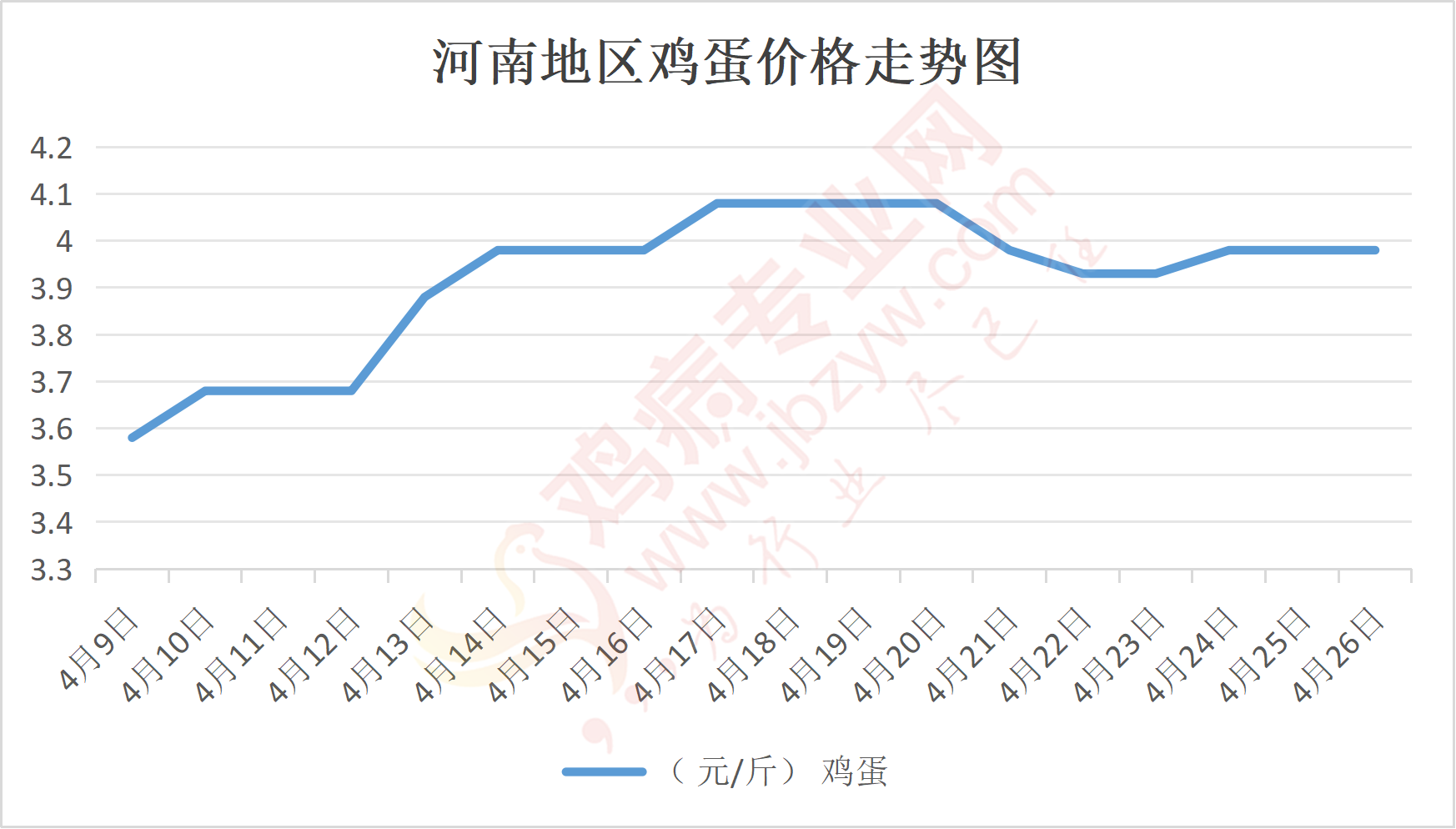 鸡病专业网消息:4月26日,河南郑州鸡蛋4元/斤,稳;新密鸡蛋4元/斤,稳;荥阳鸡蛋4元/斤,稳;中牟鸡蛋4元/斤,稳;周口鸡蛋3.95元/斤,稳;商丘鸡蛋119元/30斤,稳;鹤壁鸡蛋4元/斤,稳;汝州鸡蛋3.95元/斤,稳;开封鸡蛋119元/30斤,稳;漯河鸡蛋3.95元/斤,稳;漯河临颍鸡蛋3.95元/斤,稳;许昌鸡蛋3.95元/斤,稳;南阳鸡蛋3.95元/斤,稳;南阳邓州鸡蛋3.95元/斤,稳;新乡鸡蛋3.95元/斤,稳;安阳鸡蛋3.95元/斤,稳;新郑鸡蛋4元/斤,稳;登封鸡蛋4元/斤,稳;平顶山鸡蛋3.95元/斤,稳;驻马店鸡蛋3.95元/斤,稳;三门峡鸡蛋3.95元/斤,稳;焦作鸡蛋3.95元/斤,稳;信阳鸡蛋3.95元/斤,稳;濮阳鸡蛋3.95元/斤,稳。