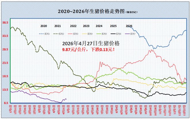 2026年4月26日,中国主流市场出栏外三元、内三元及土杂商品大猪加权日均价较昨日价格下跌,全国生猪出栏加权日均价10.03每公斤,较昨日价格下跌0.58%。多地猪价普遍下行,仅少数地区小幅上涨,区域价差明显。当前生猪供应充足,终端猪肉消费持续疲软,屠宰企业压价收猪,叠加饲料成本偏高,养殖端深度亏损,能繁母猪去化缓慢,二季度供给压力依旧偏大。五一备货高峰已过,预计近期猪价将维持低位震荡,节后行情或进一步走弱。今日全国外三元、内三元及土杂猪均价如下:1) 主流市场外三元大猪全国销售均10.15元每公斤,较昨天价格下跌0.51%;2)主流市场内三元大猪全国销售均价9.75元每公斤,较昨天价格下跌0.86%;3)主流市场土杂大猪全国销售均价9.38元每公斤,较昨天价格下跌0.53%。