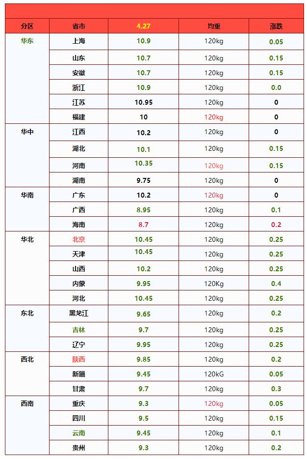 | 东北 | 辽宁省 | 10.43 | 10.40 | 0.29% | 元/KG |