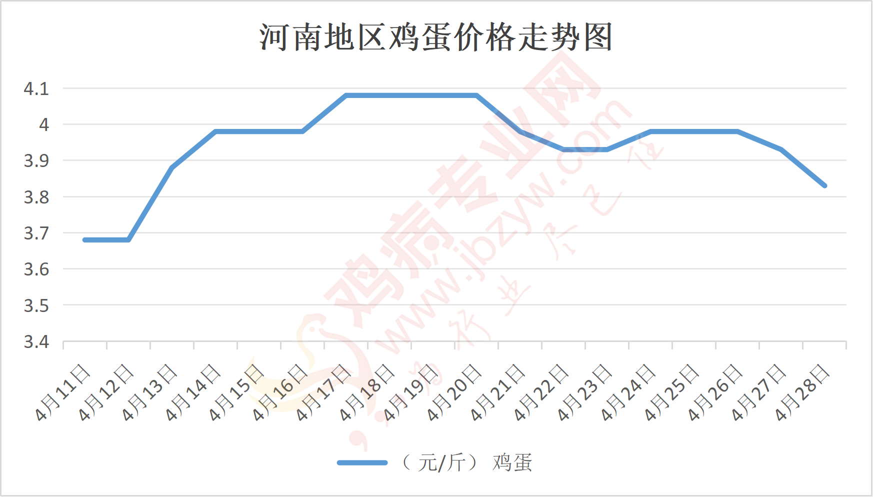 鸡病专业网消息:4月28日,河南郑州鸡蛋3.85元/斤,落;新密鸡蛋3.85元/斤,落;荥阳鸡蛋3.85元/斤,落;中牟鸡蛋3.85元/斤,落;周口鸡蛋3.8元/斤,落;商丘鸡蛋114元/30斤,落;鹤壁鸡蛋3.85元/斤,落;汝州鸡蛋3.8元/斤,落;开封鸡蛋115-116元/30斤,落;漯河鸡蛋3.8元/斤,落;漯河临颍鸡蛋3.8元/斤,落;许昌鸡蛋3.8元/斤,落;南阳鸡蛋3.8元/斤,落;南阳邓州鸡蛋3.8元/斤,落;新乡鸡蛋3.8元/斤,落;安阳鸡蛋3.8元/斤,落;新郑鸡蛋3.85元/斤,落;登封鸡蛋3.85元/斤,落;平顶山鸡蛋3.8元/斤,落;驻马店鸡蛋3.8元/斤,落;三门峡鸡蛋3.8元/斤,落;焦作鸡蛋3.8元/斤,落;信阳鸡蛋3.8元/斤,落;濮阳鸡蛋3.8元/斤,落。