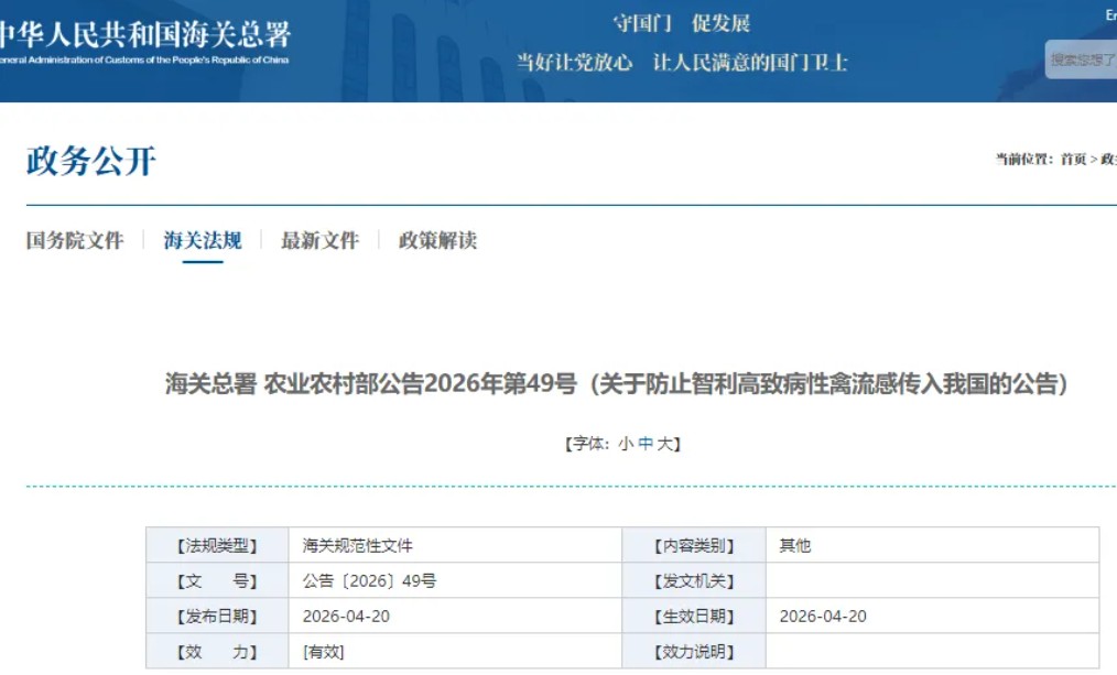 该禁令即刻生效,涵盖所有原产于智利的家禽及相关产品。海关方面称,任何在边境查获的非法智利家禽产品都将被销毁。