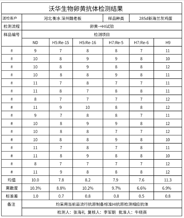 2、H9抗体水平12log2的有7只,最低抗体水平为10log2。由于禽流感国家严控,除疫区可以使用活苗(冻干苗)外,其它地区全部使用灭活苗(油苗),也就是说没有基础免疫,而没有基础免疫抗体水平不可能高于11log2,那么16个样本中有7只抗体水平是12log2,也就说明该鸡群发病了,再结合临床如果出现降蛋等基本症状,可以确诊为H9发病了。