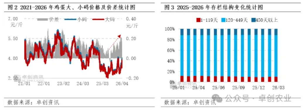 一季度蛋鸡存栏结构呈现“老鸡增、主力降、后备缓增但接力滞后”的特征。具体来看,450天以上老母鸡占比较2025年年末提升0.4个百分点,考虑到前期补栏及蛋鸡饲养周期,大码鸡蛋在季度内的供应表现相对充足。而120天-449天的产蛋鸡占比缓慢下降,同时后备鸡占比虽低位回升,但新开产鸡数量不足,因此对于季度内小码鸡蛋供应缺口的补充仍显乏力,小码蛋供给偏紧,推动小码蛋价格相对大码蛋走强,价差拉大,在一定程度上也利多大码鸡蛋价格的上涨。